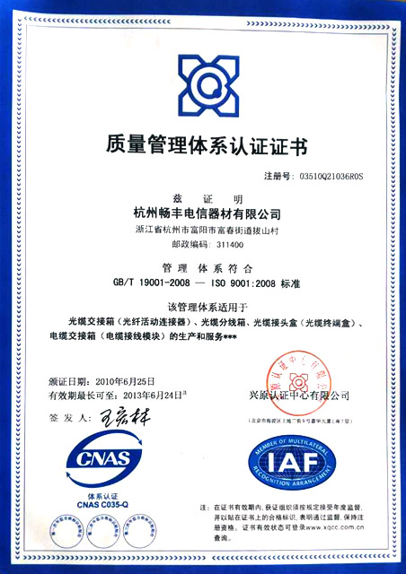 公司組織健全、科學管理,擁有一支有戰斗力的團隊。本著“質量第一、信譽至上”的經營理念,杭州暢豐電信器材有限公司將以競爭求生存,質量求效益,技術求進步,管理求發展的機制不斷生產出滿足客戶需求的產品。顧客滿意是我們永恒的追求,我們將竭誠為您服務。